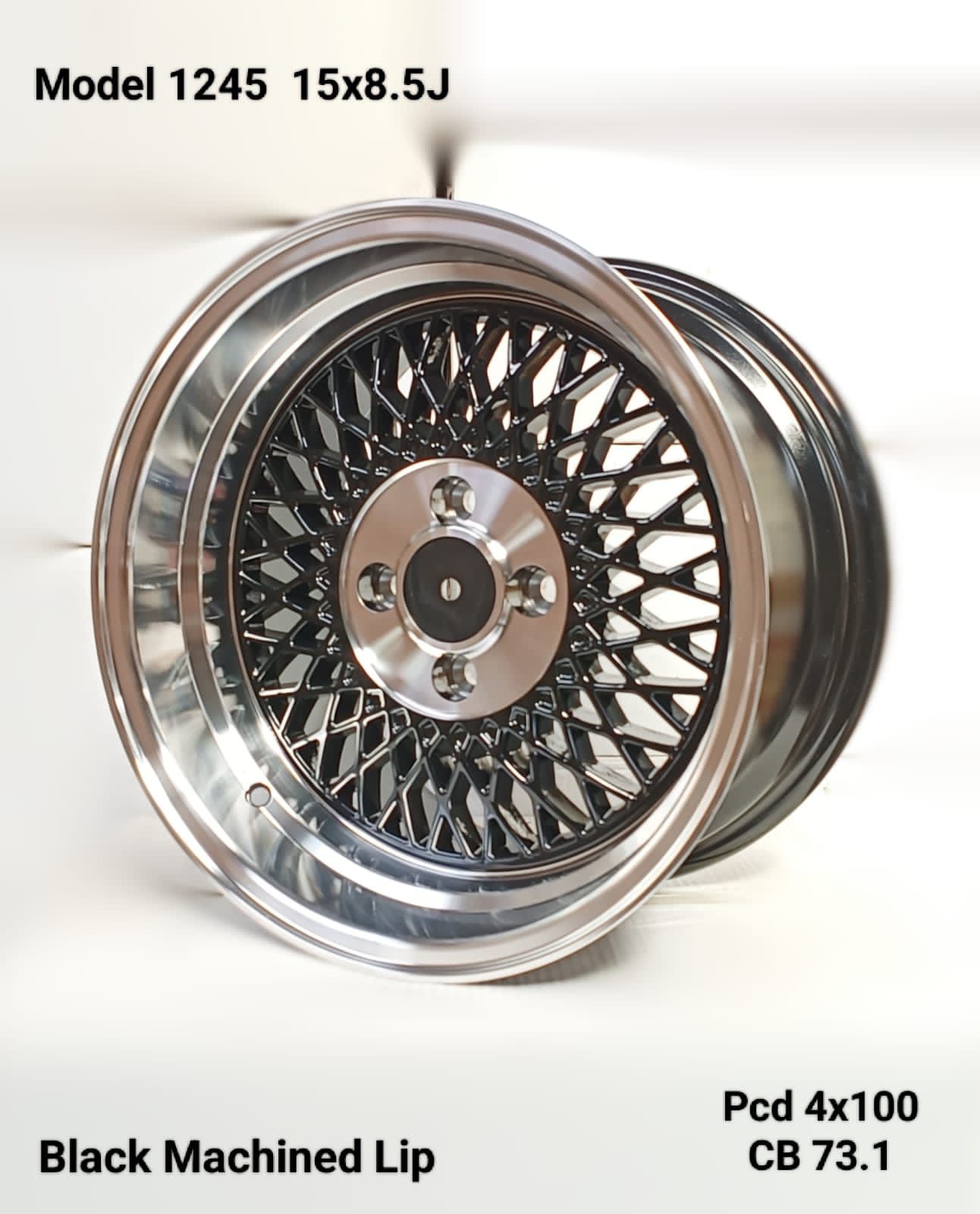 SET OF 4 – 15×8.5J 4×100 PCD CB 73.1 BLACK MACHINED LIP MAG WHEELS