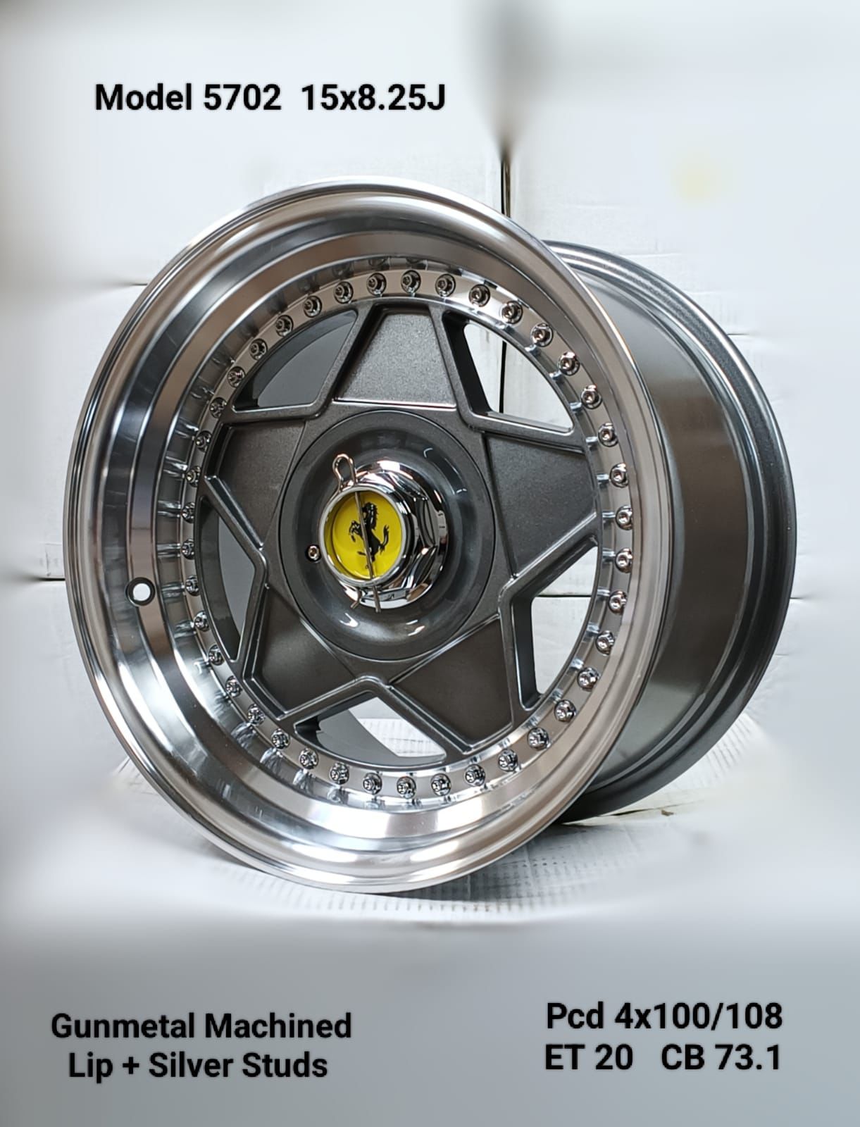 SET OF 4 – 15×8.25J ET20 4×100/108 PCD CB 73.1 GUNMETAL MACHINED LIP + SILVER STUDS MAG WHEELS